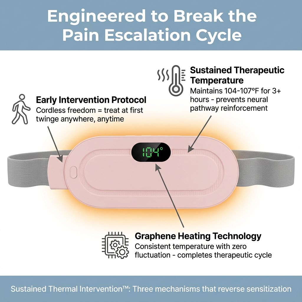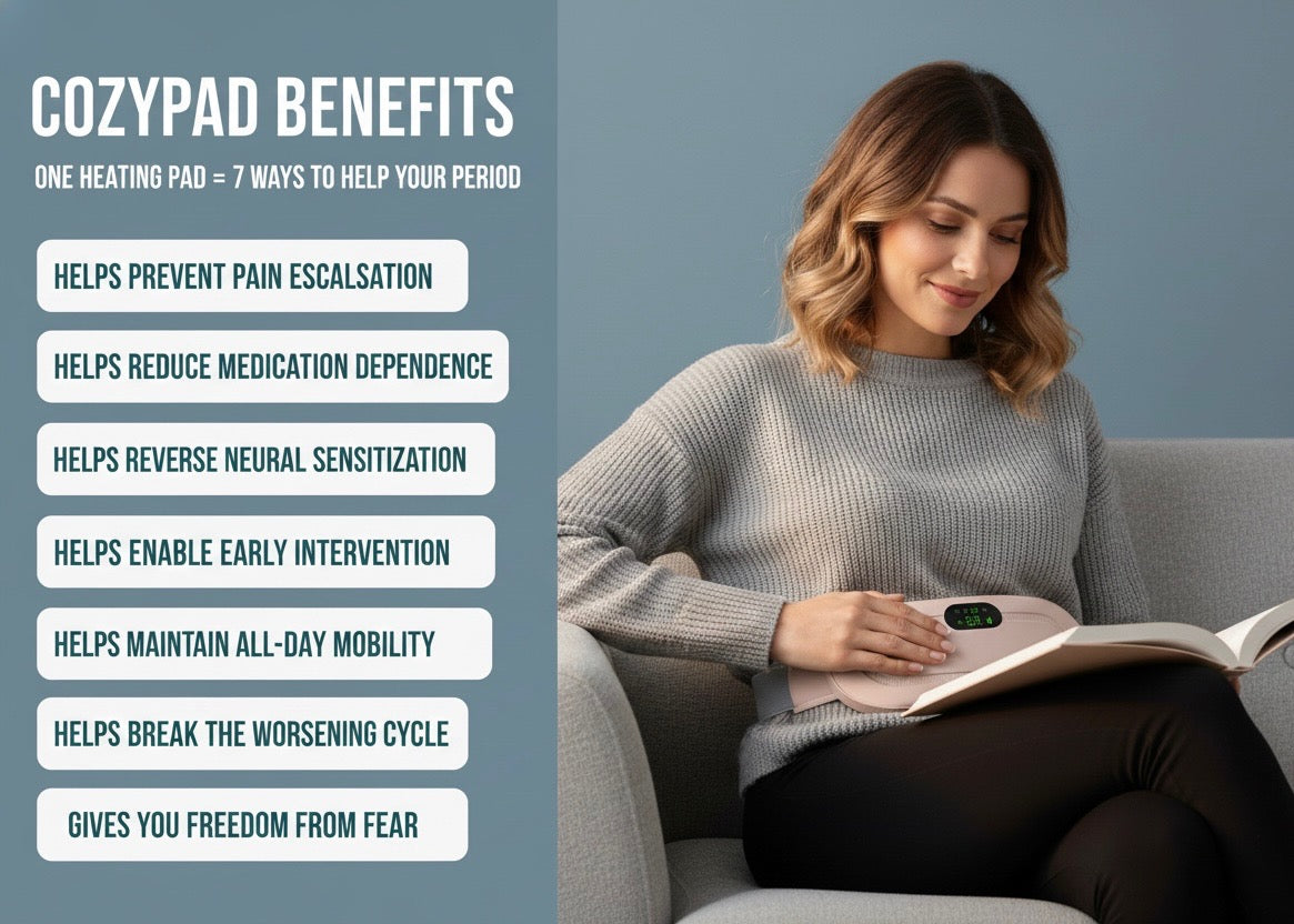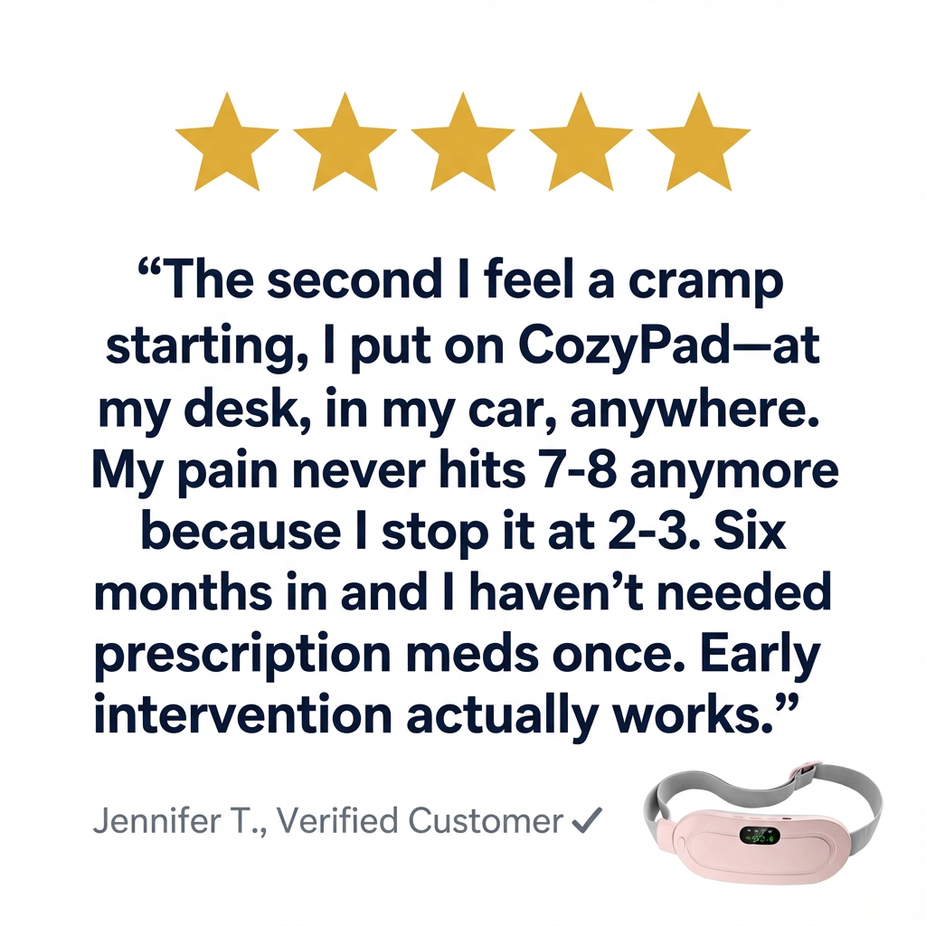 CozyPad works BY PREVENTING severe pain. When you treat cramps at pain level 2-3 (before they spike to 7-8), you interrupt the neural sensitization cycle that makes pain progressively worse. Over months, this reverses the escalation. If you’re already at severe pain, use the 107°F setting for maximum therapeutic relief while you begin the de-escalation process.