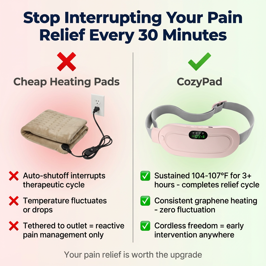 Most heating pads force reactive pain management—you use them when pain is already severe. CozyPad’s cordless design enables early intervention at the first twinge, preventing pain escalation before it starts. Plus, sustained 104-107°F for 3+ hours (vs. 30-min auto-shutoff) completes the therapeutic cycle without interruption.