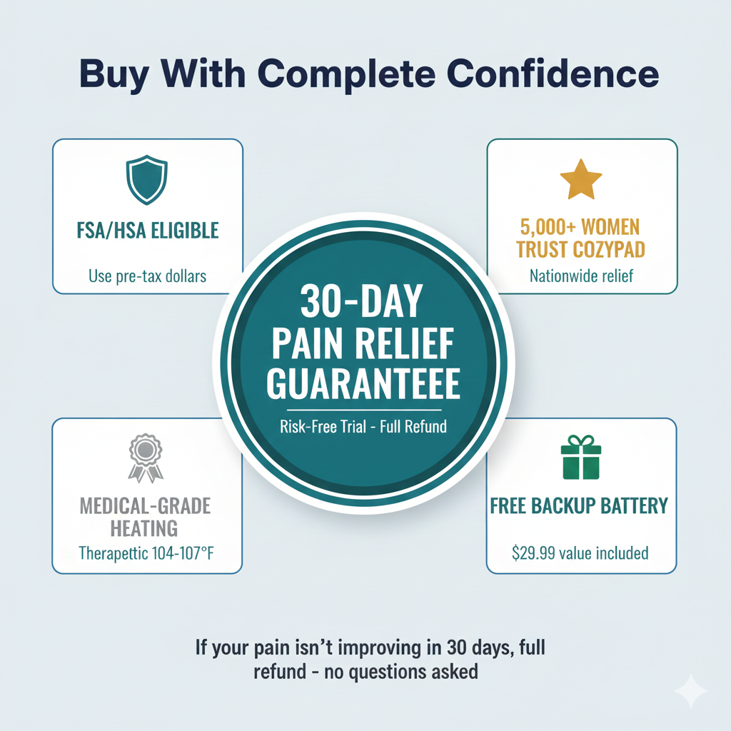 30-Day Pain Relief Guarantee. Try it for an entire menstrual cycle. If you’re not seeing improvement in pain levels or medication usage, we’ll give you a full refund—no questions asked. You risk nothing.